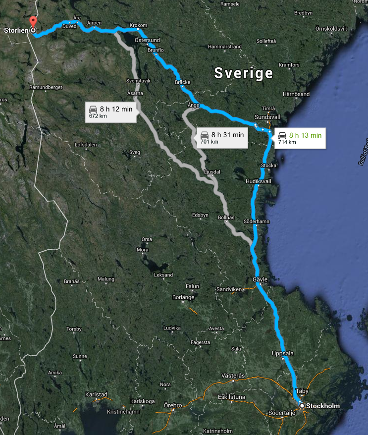 Vägsträckning: Huvudvägen E4 upp till Sundsvall 377 km, sv.wikipedia.org/wiki/E4, beskriven i avsnittet Stockholm-Haparanda samt E14 från Sundsvall till Storlien sv.wikipedia.org/wiki/E14 339 km.